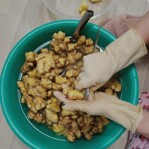 1. 생강을 물에 씻어서 껍질을 깝니다. 햇생강은 껍질이 잘 까져서 까기가 좋아요.