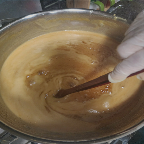 7. 냄비에 생강즙을 끓여 줍니다. 30분 정도 중불로 끓이다가 설탕을 부어서 끓입니다. 설탕이 타지 않도록 잘 저어줍니다.